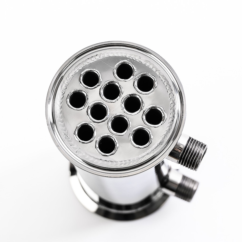 The boiler type dephlegmator is made of high quality food grade stainless steel, which guarantees safety of use and durability. The design is a hollow tube with flanges for a clamp connection of 3 inches at both ends, 12 tubes with an internal diameter of 10 mm are installed in it, the cavity around which is reliably isolated by two bridges. The fittings for supplying and withdrawing water are welded pipes with a thread diameter of 20 mm - they are designed to screw on a quick-release connection of the appropriate size (quick-release connections are not included in the kit and are purchased separately).