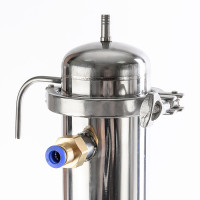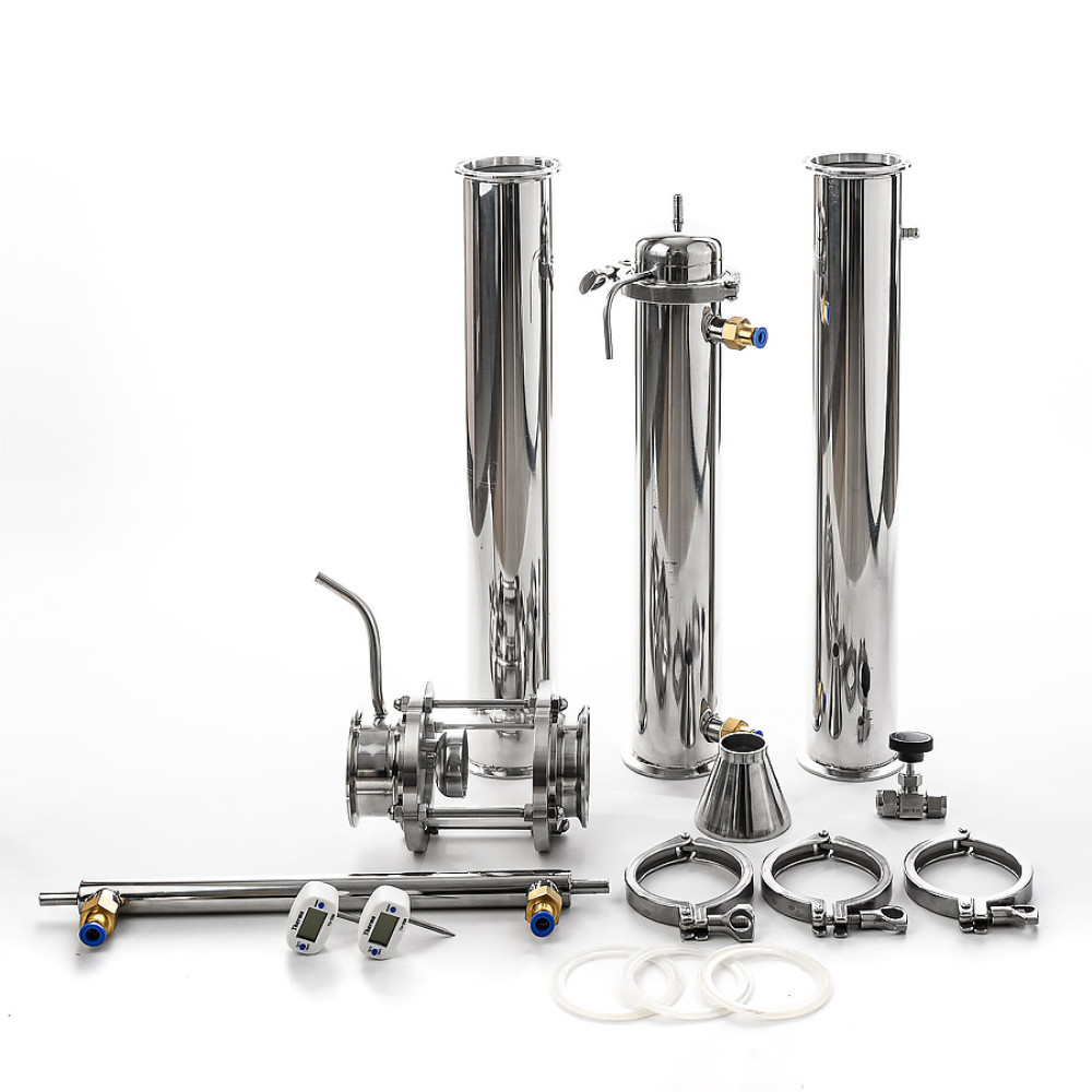 A powerful 3-inch shell-and-tube cooler with a length of 40 cm, inside which there are 12 tubes with a bore diameter of 10 mm, allows you to utilize up to 10 kW of supplied heating power per distillation cube with relatively small volumes of water consumption (depending on the temperature of the supplied water). A diopter with a built-in liquid take-off unit allows the user to set the column to a “pre-flooded” state, which will increase the separating ability of the column, which will allow 96.6% alcohol to be removed at high speed. The combination of a liquid take off and a 2-in-1 diopter simplifies column assembly and reduces the number of fittings. The jacket-type aftercooler has a diameter of 25 mm and a length of 350 mm, which indicates its high performance.